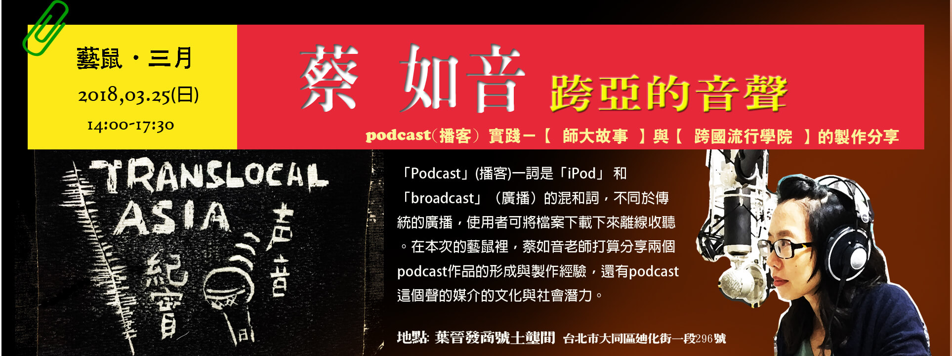 201803藝鼠:蔡如音-跨亞的音聲/podcast實踐-【 師大故事 】與【 跨國流行學院 】的製作分享